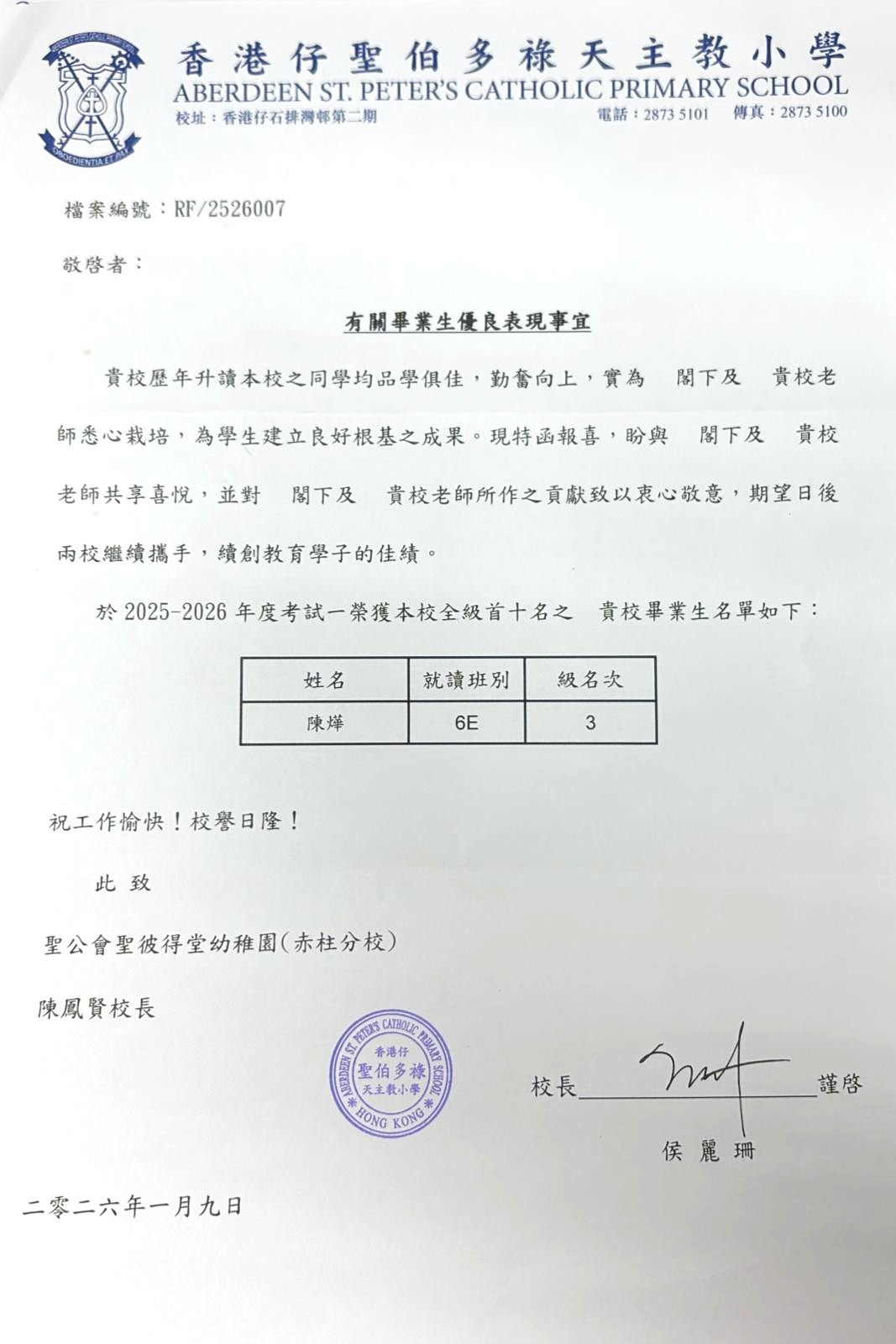恭喜本園舊生陳燁獲得2025-2026年度考試全級第三